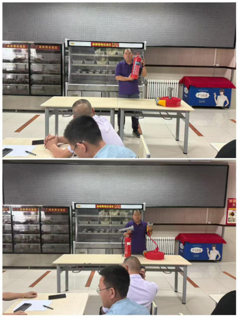 在培训中,官鹏老师首先系统讲解各类消防器材的使用方法,针对灭火器操作,示范了“提、拔、握、压”的正确步骤。结合食堂工作场景,强调餐厨设备操作规范及应对不同类型火情选择正确灭火点及操作要点。对于消火栓的操作,官鹏老师从如何打开阀门、展开水带,到连接水枪进行灭火,对每一个环节都进行了细致说明。同时,还重点讲解了灶台灭火三步法,让大家在面对厨房火情时能够迅速、有效地进行处置。